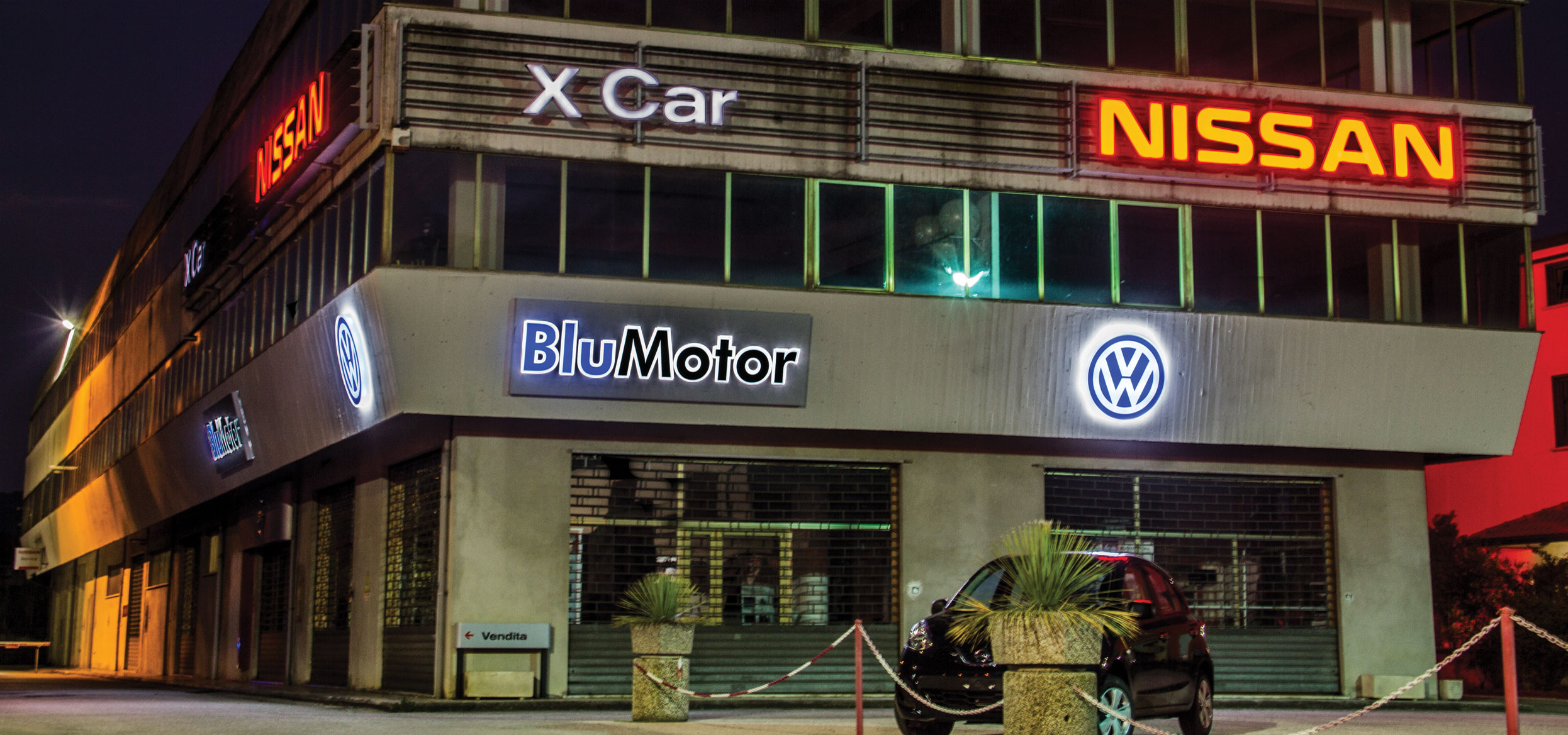 Insegna monofacciale su facciata principale composta da cassoni luminosi con pannellatura in Dibond traforata. Logo volkswagen realizzato il plexiglass modellato.